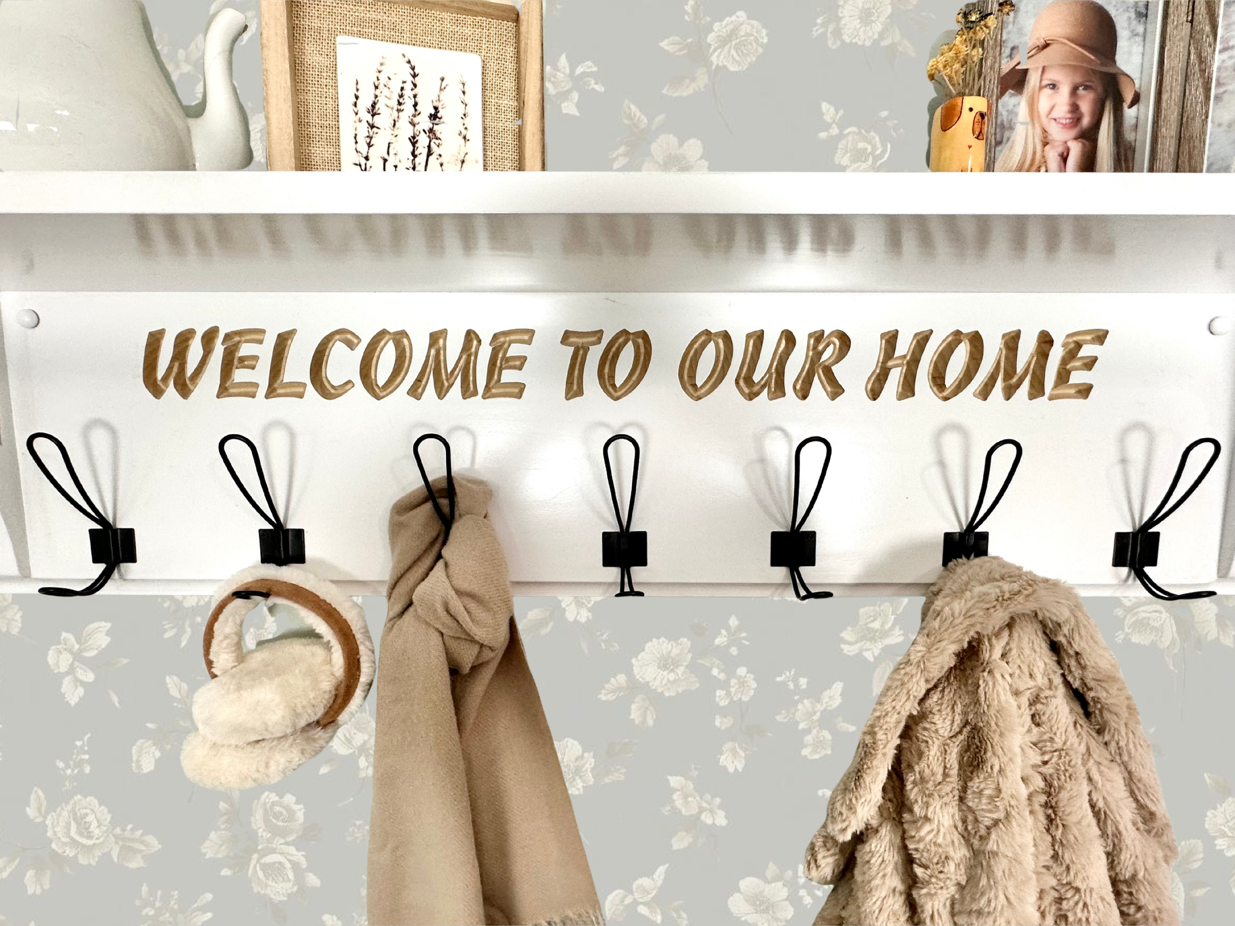 This gorgeous handcrafted farmhouse shelf can be personalized with your chosen word(s). It will be sure to WOW your guests no matter where you utilize it. Perfect for your modern farmhouse entryway or modern farmhouse home! I could see this in a farmhouse bathroom, used for hanging towels and bathrobes. I could also see it in your farmhouse kitchen, holding your garden hat, aprons, or your favorite basket. We've chosen the very popular black farmhouse wire double coat hooks to set this shelf apart.